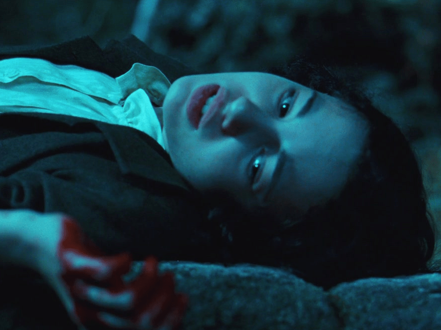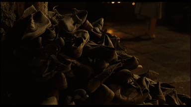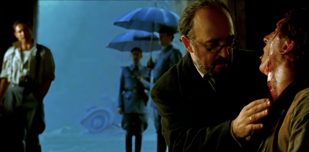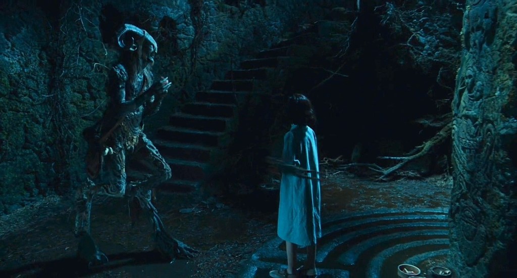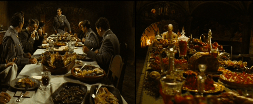 - Small details within the set/props/location/costumes. For example, Ofelia’s red shoes compared to the pile of grey shoes where the Pale man creature was seen in the film. Also, Captain Vidal is referred to the Pale man creature as he sat at the head of the table with a large feast, similar to the creature Ofelia sees.